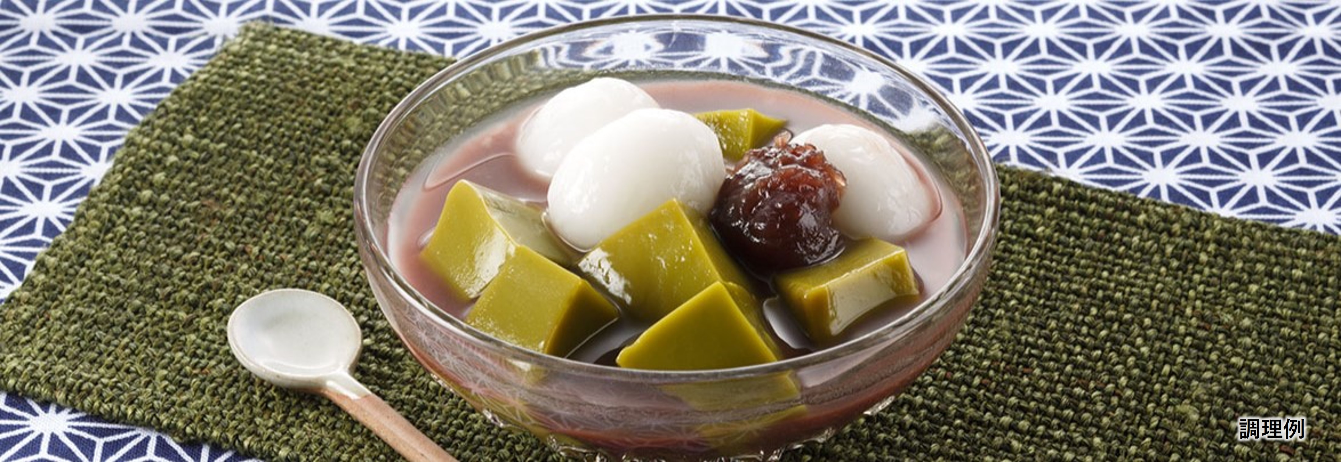 ●抹茶とうふを角切りにし、一口大にカットしたフルーツや白玉などと一緒に盛り付けて、おもてなしデザートに。