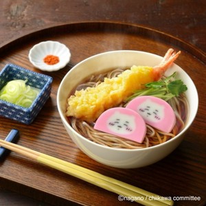 器にそばを盛りつゆをかけ、ちいかわかまぼこ、みつ葉、えびの天ぷらをのせる。