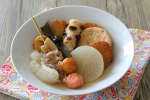 一正のおでん袋の具、大根、こんにゃく、ゆで卵をランダムに串に刺す。