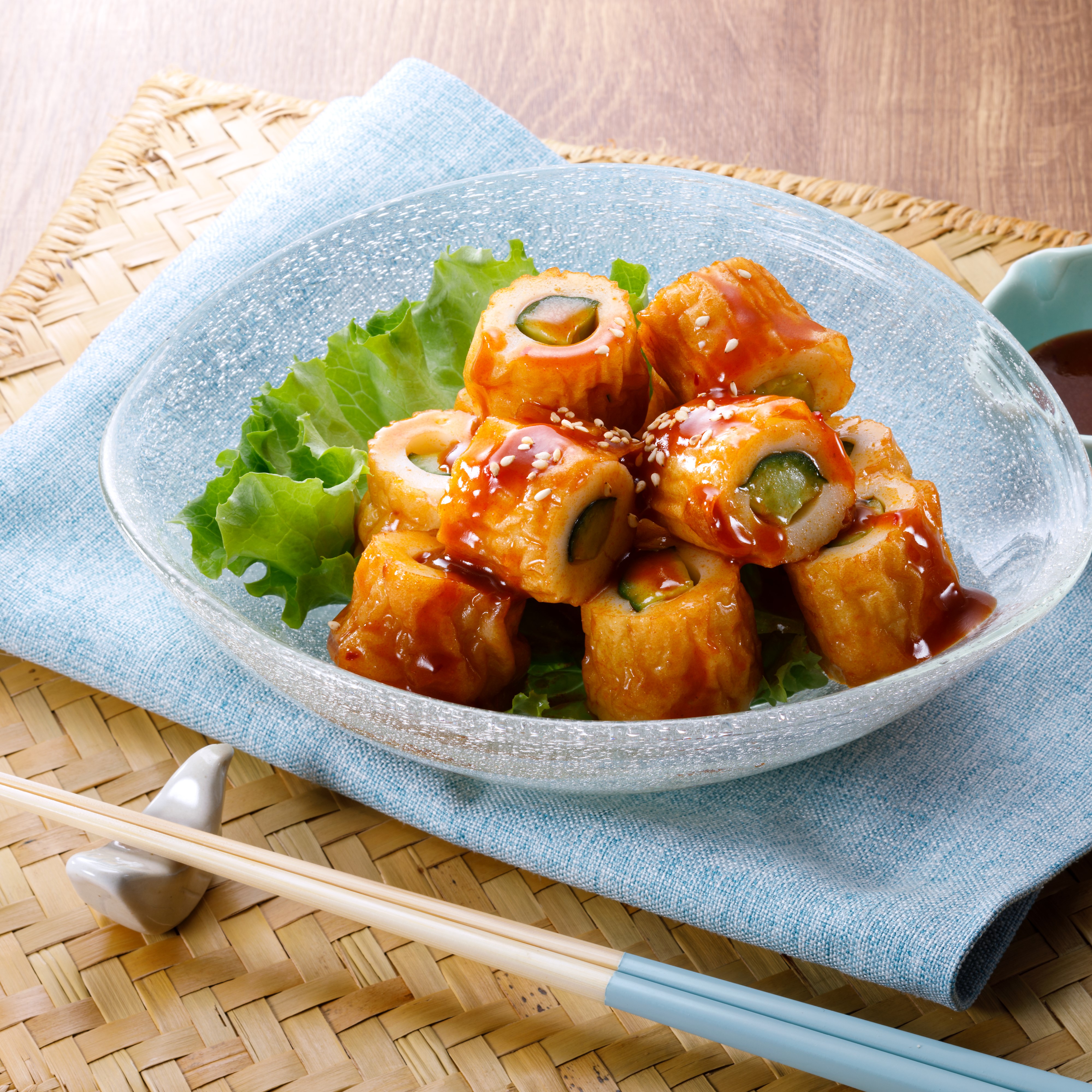 鱧入りちくわにきゅうりを詰めて、韓国風の辛旨ソースで和えた、さっぱり&ピリ辛なおつまみです...