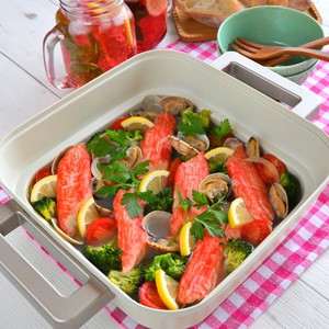 ほぐしたカニかまをお好みの野菜と共にホイル焼きにする。レモンをかけてできあがり。