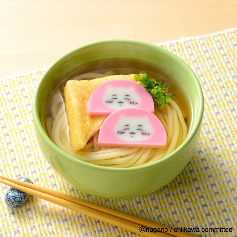 器にうどんを盛り、つゆをかけ油揚げ、ちいかわかまぼこ、青ねぎ(小口切り)をのせたらできあがり。