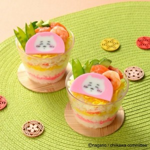 ちいかわかまぼこ、絹さや、サーモン、えび、きゅうりをのせてできあがり。