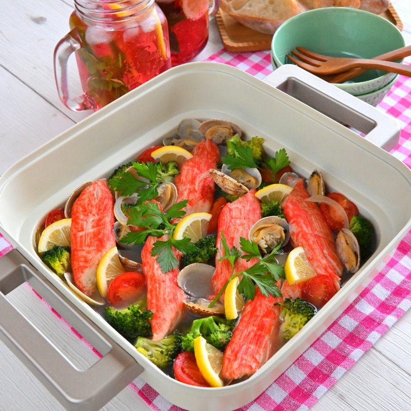 ホットプレートを200℃にし、水、ガブリッチ 魅惑のカニかま、ミニトマトを加え、蓋をして、あさりの口が開くまで5?6分蒸す。