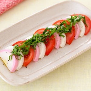 ラップで丸形に成形した酢飯に薄切りしたきゅうりをまきつけ、切ったまめかまを3枚飾ってできあがり。
