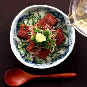 手順3にうな次郎をのせ残りのたれをかけ、万能ねぎの小口切りを散らしてできあがり。