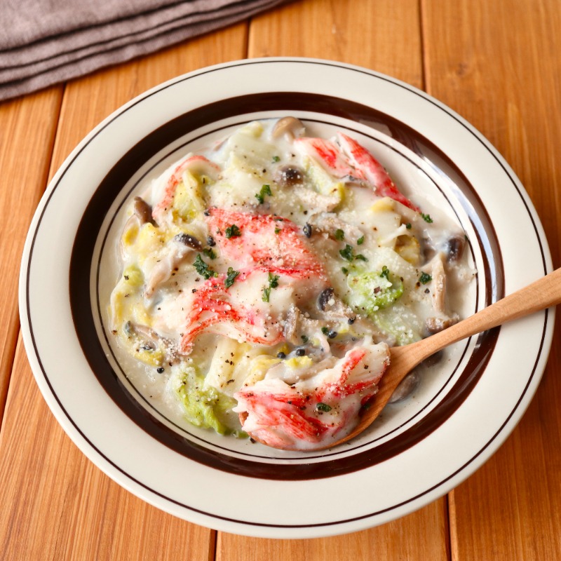 寒い時期にほっこり温まる、ワンパン10分で作れるカニかま&白菜のクリーム煮のレシピです。生...