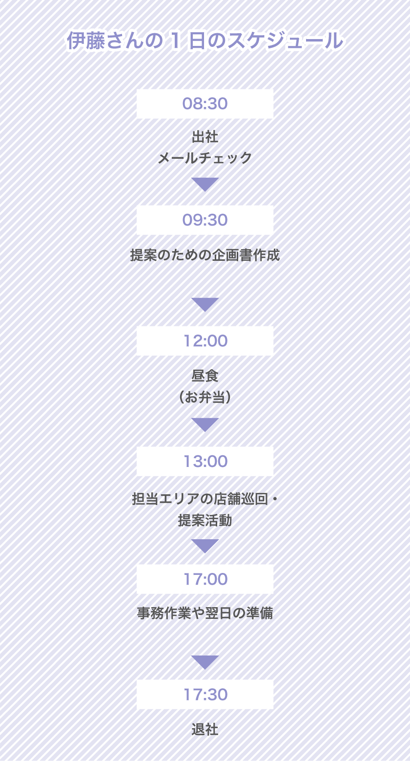 日々、お客さま先を訪問し、季節毎の商品のご紹介、売場構成や販売方法の提案を行っています。言うなれば、お客さまにとっての一正蒲鉾の顔、それが私たち営業職です。